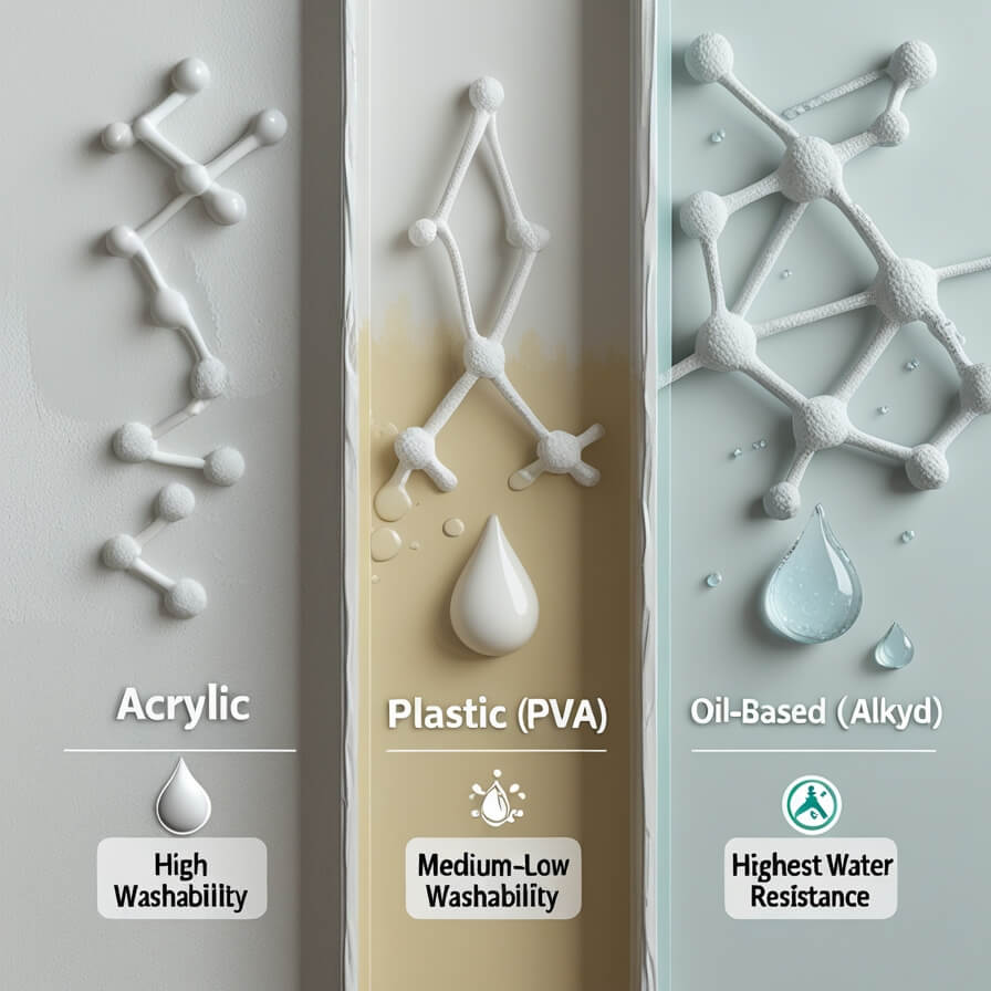 در هنگام انتخاب رنگ برای دیوارها، میزان مقاومت آن در برابر شستوشو اهمیت زیادی دارد. سه گروه رایج عبارتاند از رنگهای اکریلیک، پلاستیک (PVA) و روغنی (آلکیدی). تفاوت اصلی این رنگها به نوع رزین یا چسب پایه و رفتار لایهٔ رنگ پس از خشک شدن بازمیگردد.